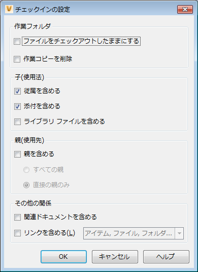 [チェックイン]ダイアログ ボックスを非表示にすると、該当するボールト操作が関連ファイルにどのように影響するかを指定できます。