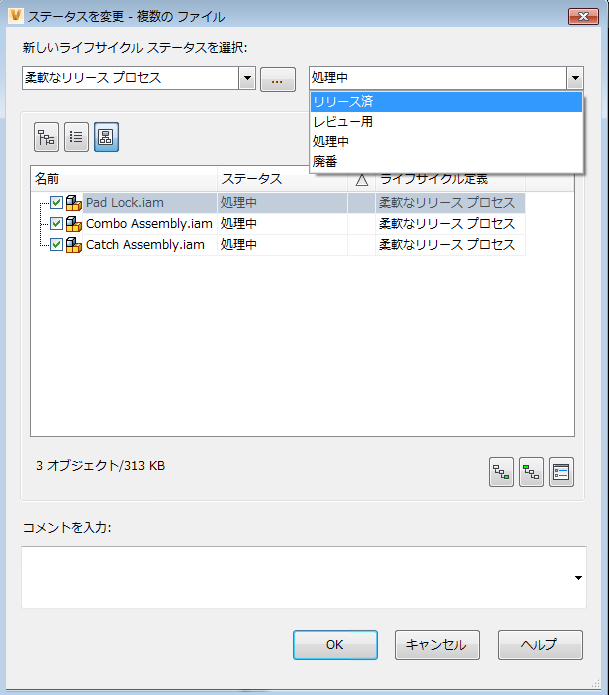 [カテゴリを変更]コマンドを使用すると、ファイル、フォルダ、アイテム、およびカスタム オブジェクトのライフサイクル ステータスを変更することができます。Vault オブジェクトのライフサイクル ステータスを変更すると、Vault 管理者が設定した特定のライフサイクルの動作が実行されます。ステータスには、[作業中]、[リリース済]、[廃番]などがあります。