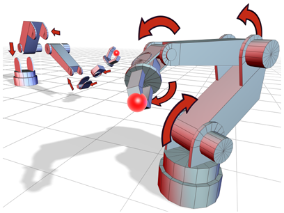 왼쪽: 분해된 로봇 팔이 계층 구조에 연결되어 있음