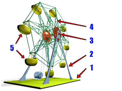상위의 제어를 받는 오브젝트입니다. 하위 오브젝트라 하더라도 다른 하위의 상위가 될 수 있습니다. 다음 그림에서 오브젝트 2와 3(지지 및 허브)은 오브젝트 1의 하위입니다. 오브젝트 5(의자)는 오브젝트 4 페리스 휠의 하위입니다.