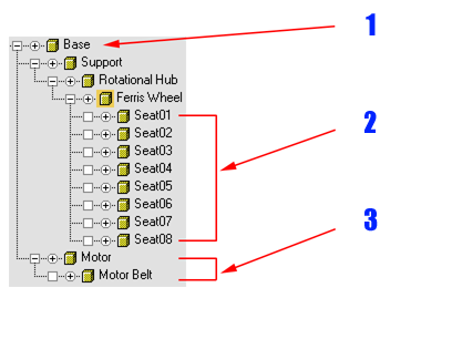 아래 계층 구조에 표시된 것처럼 페리스 관람차의 좌석은 휠의 하위가고, 이 휠은 바닥 및 지지대 오브젝트의 하위입니다.