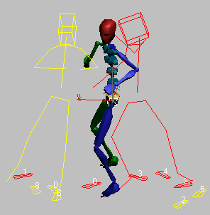 고스트 그룹의 프레임 스피너를 사용하면 막대 그림(고스트)을 표시하여 소스 및 대상 클립을 보고 움직일 수 있습니다. 노란색 및 빨간색 막대 그림은 소스 및 대상 클립을 표현합니다. 소스 Biped와 대상 Biped가 이 움직임 프로세스 중에 서로 멀리 있을 수도 있습니다. 시작 프레임 설정을 클릭한 경우 대상 클립이 재배치됩니다. 적합한 시작 프레임을 찾은 경우 시작 프레임 설정을 클릭하여 프레임 필드의 값을 시작 프레임 필드로 복사합니다. 제공된 필드에서 푸트 위치 상태를 모니터링합니다.