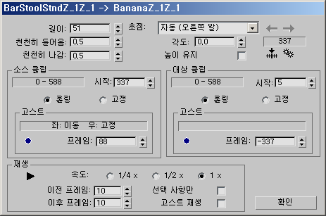 소스 또는 대상 클립에 대해 전환 시작 프레임을 설정합니다. 시작 프레임은 전체 애니메이션의 프레임 범위가 아닌 클립 자체를 기준으로 합니다.
