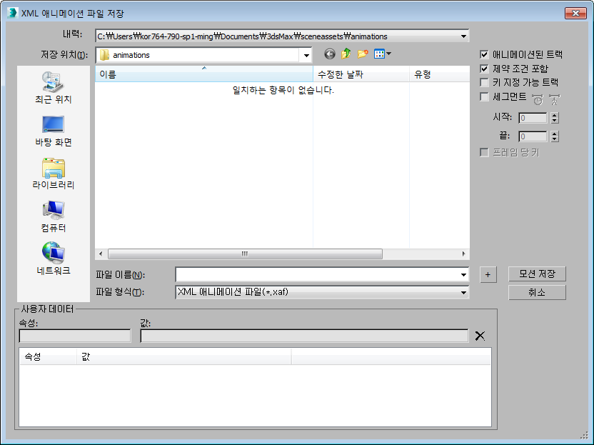 이 컨트롤은 사용자 속성과 이름을 입력할 수 있도록 합니다. 이는 단순히 애니메이션 파일에 대한 참고이거나 사용자 정의 플러그인과 유틸리티에 의한 사용을 위한 실질적인 데이터일 수 있습니다.