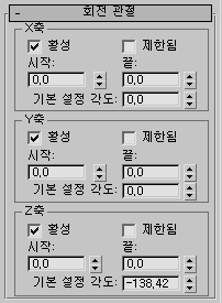 활성 축에서 허용되는 회전 범위를 제한합니다. 시작 및 끝 스피너와 함께 사용합니다. 대부분의 관절은 활성 축에서 회전 범위가 제한됩니다. 예를 들어 축을 중심으로 회전하는 바퀴를 한 축만 중심으로 회전하도록 제한할 수 있습니다.