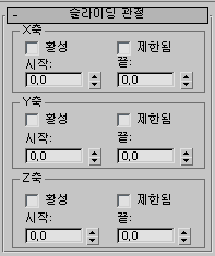 활성 축에서 허용되는 모션 범위를 제한합니다. 시작 및 끝 스피너와 함께 사용합니다. 대부분의 관절은 활성 축에서 모션 범위가 제한됩니다. 예를 들어 피스톤은 원통 길이 내에서만 슬라이딩합니다.