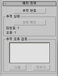 카메라 추적기 유틸리티의 배치 트랙 롤아웃은 추적기가 설정되고 나면 형상 방관적 추적을 수행합니다. 추적기 집합을 설정하고, 일괄 추적을 시작한 다음 이 패널의 다른 도구를 사용하여 탐지된 추적 오류를 확인하고 검토할 수 있습니다. 이 패널에서 추적 완료도 확인합니다.