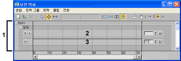 모션 믹서를 사용하면 Biped나 Biped가 아닌 오브젝트의 모션 파일(BIP 파일 및 XAF 파일)을 혼합할 수 있습니다. 이러한 모션 파일을 클립이라고도 합니다.