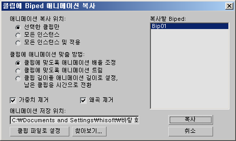 클립에 Biped 애니메이션 복사 대화상자는 트랙에서 한 개 이상의 클립을 선택하고 클립 메뉴에서 소스 로드