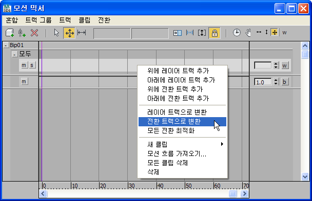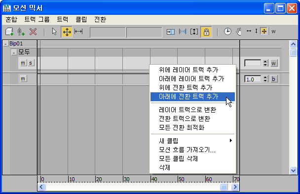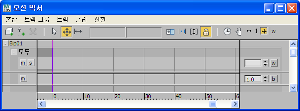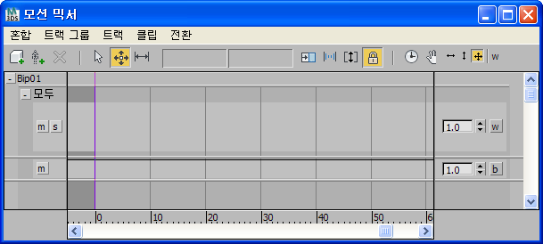 믹서를 열고 혼합할 오브젝트를 추가한 다음 모션 클립을 클립 트랙에 로드하여 모션 믹서에서 혼합 프로세스를 시작합니다. Biped가 선택되어 있는 동안 믹서를 열면 자동으로 하나의 클립 트랙이 생성되지만 믹싱된 오브젝트에 사용할 모든 모션을 포함하려면 추가 클립 트랙이 필요합니다.