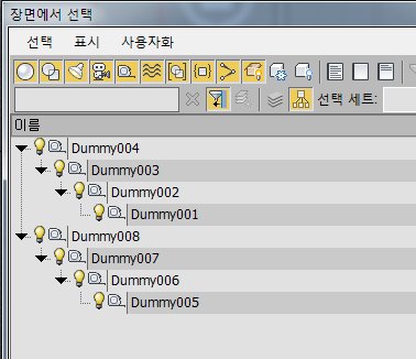 이름을 선택하거나 기본 도구 모음에서 이름별 선택을 클릭하거나 또는 H 키를 눌러 이름별 선택 방법을 사용할 때마다 나타납니다. 오브젝트를 계층 구조로 나열하려면 대화상자의 하위 트리 표시를 설정합니다. 그러면 하위가 그 상위 아래에 들어갑니다.