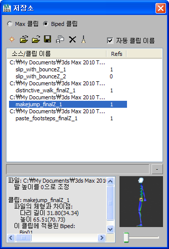 클립 상태 창은 저장소의 왼쪽 하단에 나타나고 특정 클립이 사용된 방식에 대한 정보를 제공합니다. BIP 또는 XAF 파일의 소스 위치와 같이 파일 정보를 가져올 수 있습니다. 클립이 모션 믹서에 나타날 때 해당 클립 참조 이름 등의 클립 정보도 표시됩니다. 또한 Biped 구조에 대한 정보가 클립이 업데이트되는 Biped와 함께 나열됩니다.