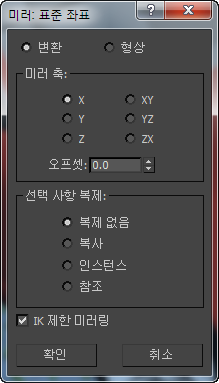 또한 미러 도구를 사용하여 현재 좌표계 중앙에 위치한 현재 선택 사항을 미러링할 수 있습니다. 미러 대화상자를 이용하여 동시에 복제를 만들 수 있습니다. 계층 링크를 미러링하는 경우, IK 제한을 미러링하는 옵션이 있습니다.