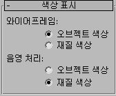 색상 표시 롤아웃에서는 오브젝트의 디스플레이 특성 이 오브젝트별로 설정된 경우 3ds Max에서 오브젝트를 표시할 때 와이어프레임 색상(오브젝트 색상이라고도 함)을 사용할지 또는 분산 재질 색상을 사용할지를 지정합니다.