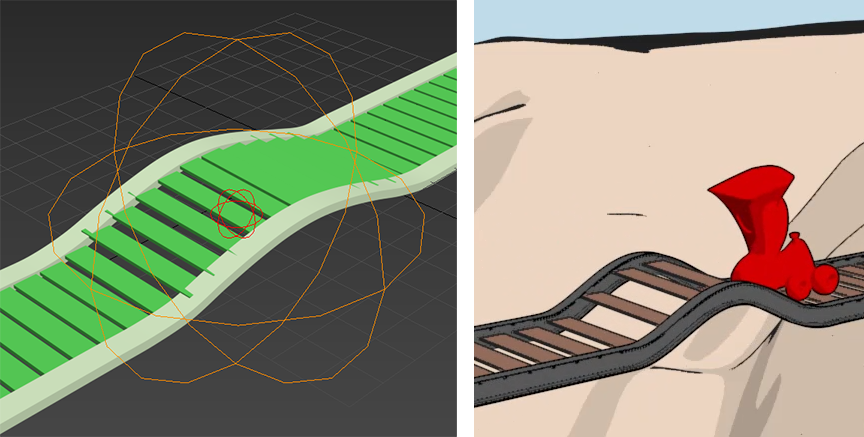 표시된 영향 도우미가 정점을 선택하여 만화 기차의 애니메이션에 사용된 효과를 작성할 수 있습니다. 내부 기즈모는 모든 내부 정점에 최대 영향을 적용하는 반면, 외부 기즈모는 효과를 점진적으로 테이퍼링합니다.