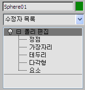 하위 오브젝트 수준에서 오브젝트를 수정하는 경우 정점, 가장자리, 다각형 등 해당 수준에 있는 구성요소만 선택할 수 있습니다. 현재 오브젝트를 선택 해제할 수 없으며 다른 오브젝트를 선택할 수도 없습니다. 하위 오브젝트 편집을 그만하고 오브젝트 수준 편집으로 돌아가려면 수정자 스택에서 해당 오브젝트의 최상위 이름을 클릭하거나 강조 표시된 하위 오브젝트 수준을 클릭합니다.