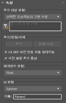 추가 대상 유형 리스트의 현재 선택 항목에 따라 현재 오브젝트, 수정자, 재질 또는 트랙에 사용자 정의 속성 매개변수를 적용합니다.