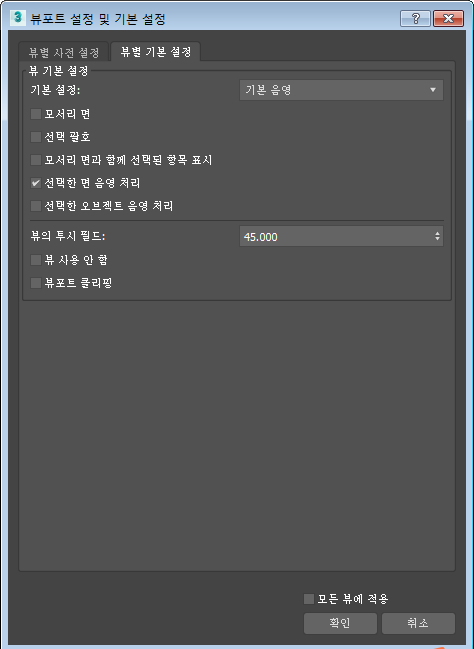 투시 뷰포트의 시야 각도를 설정합니다. 기본값은 45.0도입니다.