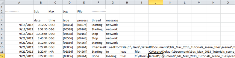 3ds Max 2015의 로그 파일에는 열 제목이 포함되어 있으며 항목에는 프로세스 및 이 항목을 추가한