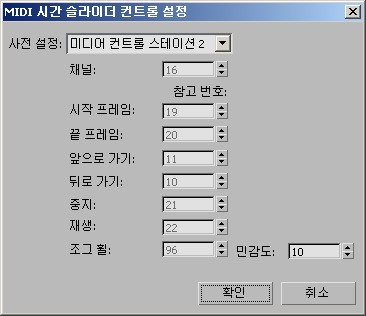 MIDI 시간 슬라이더 컨트롤 설정 대화상자로 MIDI 장치를 지정 및 설정하여 애니메이션 재생을 제어할 수 있습니다.