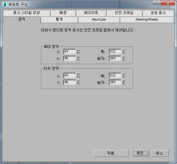 뷰포트 구성 대화상자의 영역 패널에서 확대 영역 및 하위 영역 렌더링 옵션에 기본 선택 직사각형 크기를 지정합니다.