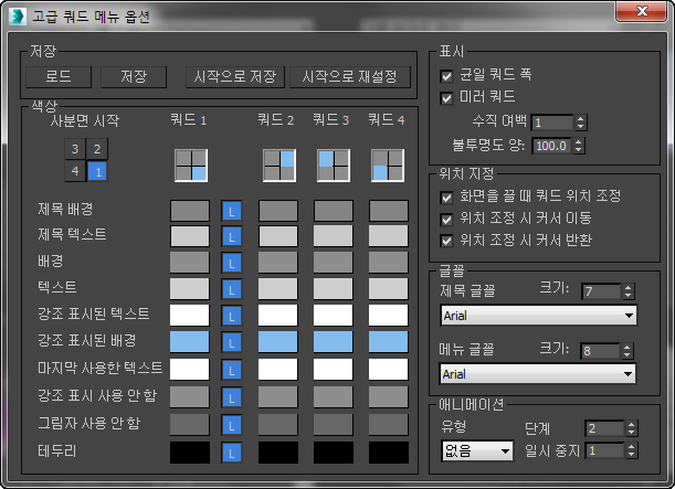 고급 쿼드 메뉴 옵션 대화상자에서는 쿼드 메뉴의 크기와 색상을 사용자 정의할 수 있습니다. 위치 조정, 글꼴 및 커서 동작과 같은 기타 쿼드 메뉴 동작을 사용자 정의할 수도 있습니다.