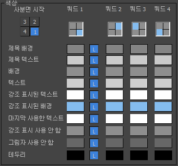 쿼드 메뉴의 사용자 정의 가능 요소를 나열하고 사분면으로 구분합니다. 색상 견본을 클릭하면 색상 선택 대화상자가 열립니다.