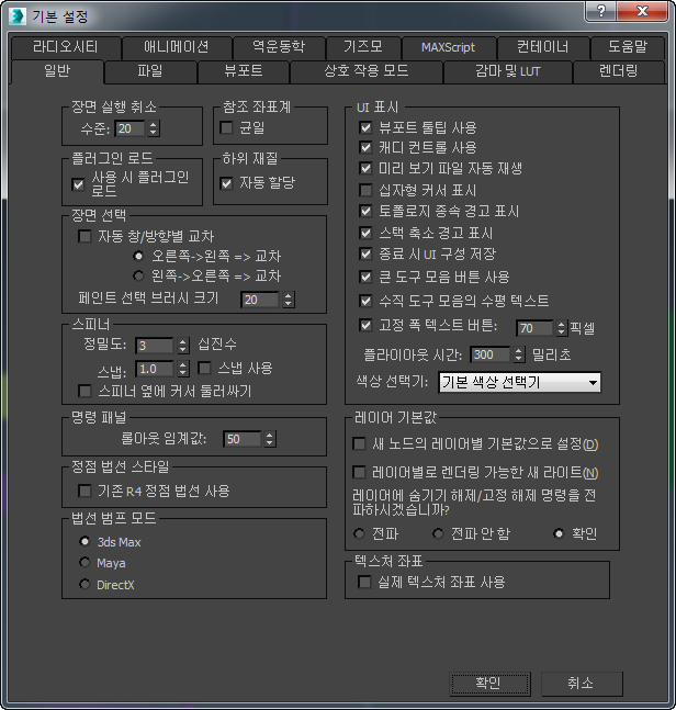 3ds Max는 해당 디스플레이 및 연산을 위한 많은 옵션을 제공합니다. 기본 설정 대화상자의 일련의 탭 패널에서 이러한 옵션을 사용할 수 있습니다.