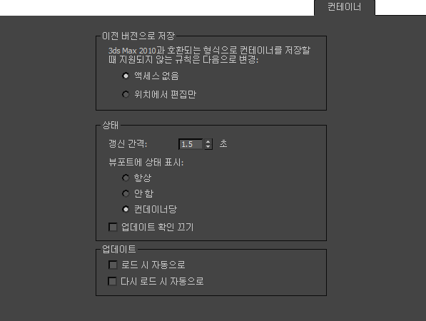 이러한 설정은 컨테이너를 로드 또는 다시 로드할 때 3ds Max에서 업데이트를 자동으로 수행하는지 여부를 결정합니다.