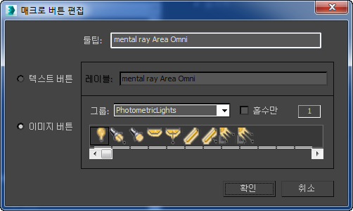 [스크롤할 수 있는 아이콘 리스트]선택한 그룹에 대해 사용 가능한 아이콘을 표시합니다. 도구 모음 버튼에 아이콘을 할당하려면 이 리스트에서 강조 표시한 다음 확인을 클릭합니다.
