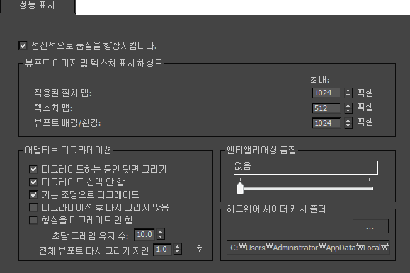 - 설정하면 뷰포트 품질이 점진적으로 향상됩니다. 이 옵션은 Quicksilver 하드웨어 렌더러가 연속 반복을 통해 품질을 향상시키는 것과 비슷한 방식입니다. 기본적으로 설정되어 있습니다.