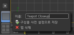 메모리에서 허용하는 만큼 많은 레이아웃을 장면에 사용할 수 있습니다. 한 세션에서 추가하는 탭은 장면과 함께 저장되고 로드됩니다. 저장된 데이터에는 뷰포트 탐색 설정 및 렌더링 모드를 포함하여 각 레이아웃의 관련 측면이 모두 포함됩니다.