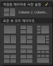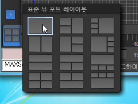 뷰포트 레이아웃 사전 설정 메뉴가 열립니다. 사용자 정의 사전 설정을 저장하지 않았으므로 표준 뷰포트 레이아웃만 포함되어 있습니다. 각 항목은 해당 레이아웃을 나타내는 축소판 아이콘으로 표시됩니다.