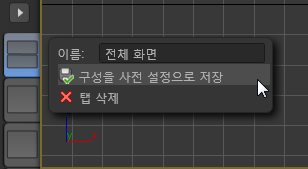 방금 만든 탭이 사라집니다. 탭은 세션 간에 유지되지 않습니다. 서로 다른 장면에서 사용자 정의 레이아웃을 사용하려면 다음 절차에 설명된 대로 사전 설정 기능을 사용하십시오.