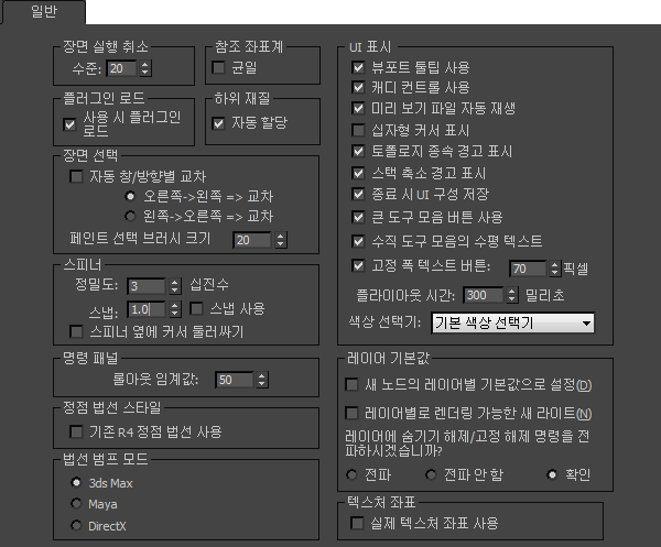 두 방법 모두 기본 설정 대화상자의 일반 패널을 엽니다. 스피너 스냅의 2개의 컨트롤은 이 패널의 스피너 그룹에 있습니다.