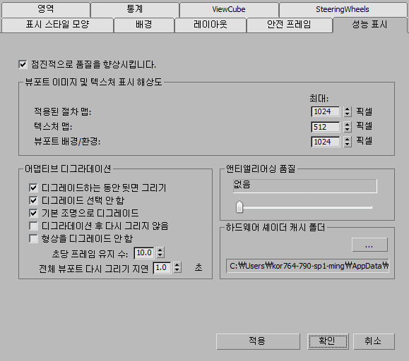 - 설정하면 디그라데이션 중 모든 뷰포트 라이트를 끄고 기본 조명을 활성화하여 성능을 높입니다. 기본적으로 설정되어 있습니다.