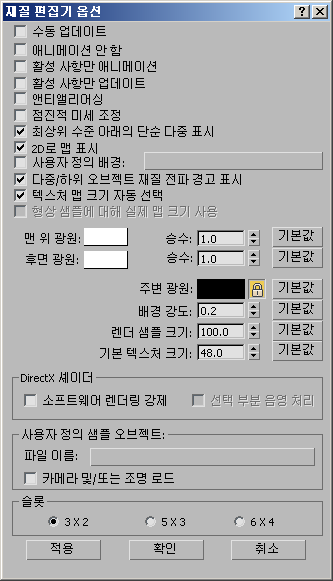 이 버튼을 클릭하면 재질 편집기 옵션 대화상자가 표시되어 재질과 맵이 샘플 슬롯에 표시되는 방법을 제어할 수 있습니다.