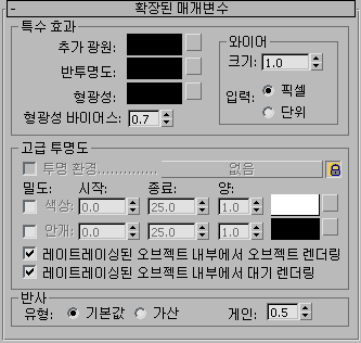 와이어프레임 제어를 제외하면 레이트레이싱 재질의 확장된 매개변수 롤아웃에 있는 제어는 레이트레이싱 재질과 관련이 있습니다.