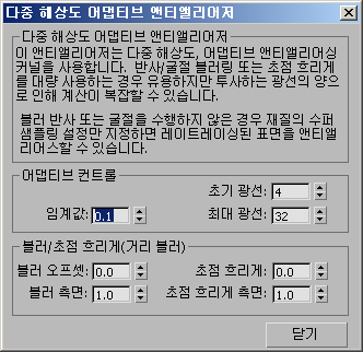 여러 해상도 어댑티브 앤티앨리어저 대화상자에서는 레이트레이싱 재질 및 맵의 여러 해상도 어댑티브 앤티앨리어저에 대한 설정을 변경합니다. 이 대화상자를 레이트레이서 전역 매개변수 롤아웃에서 전역으로 사용하거나 레이트레이서 제어 롤아웃에서 로컬로 사용할 수 있습니다. 앤티앨리어저의 설정을 로컬로 변경해도 해당 앤티앨리어저의 전역 설정에는 영향을 주지 않습니다.