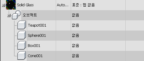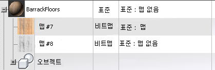 표시 하위 재질/맵 표시를 설정하면 재질 계층에 해당 재질에 사용되는 맵도 표시됩니다. 맵은 해당 재질을 사용하는 오브젝트 위에 나타납니다.