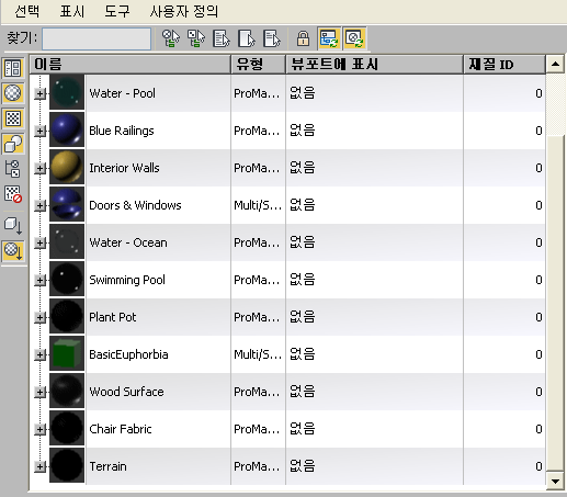 재질 탐색기의 위쪽 장면 패널에서는 장면의 모든 재질을 찾아보고 관리할 수 있습니다.