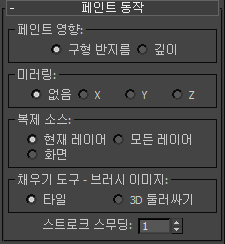 페인팅 도구와 브러시 설정이 포함된 주 인터페이스 외에도 뷰포트 캔버스에는 추가 설정, 도구 및 옵션이 포함된 다양한 롤아웃이 포함되어 있습니다. 이 항목에서는 이러한 롤아웃에 대해 설명합니다.