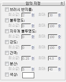 설정하면 브러시를 적용할 때마다(연속 스트로크 내에서 적용하는 경우 포함) 브러시 분산 값을 최대값과 최소값 사이에서 임의 지정합니다.
