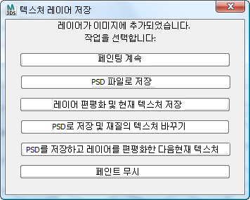 뷰포트 캔버스를 사용하여 JPEG 또는 PNG 파일과 같은 단일 레이어 비트맵 텍스처에 레이어를 하나 이상 추가한 다음 페인트 또는 기타 도구를 종료하면 뷰포트 캔버스에서 이미지 처리를 위해 선택할 수 있는 옵션이 포함된 텍스처 레이어 저장 대화상자가 열립니다. 선택 사항은 다음과 같습니다.