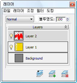 현재 레이어가 아래쪽 레이어를 가리는 정도입니다. 불투명도가 100%이면 아래쪽 레이어가 숨겨지고, 불투명도 값이 낮으면 현재 레이어가 점점 투명해집니다.