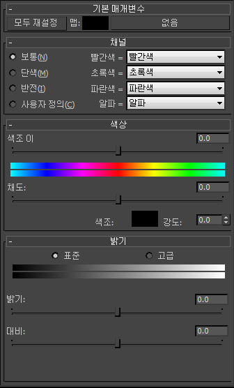 이 롤아웃은 전체 색상 변환에 대한 세 가지 제어를 제공합니다. 세 제어는 채널 롤아웃의 출력에 대해 작동합니다. 원래 맵을 사용하려면 채널 롤아웃이 보통으로 설정되어 있어야 합니다.