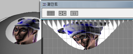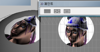 2D 페인트 창(오른쪽)에 적용되는 이미지는 구 표면에서 왜곡되어 나타납니다.