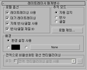이 그룹의 제어를 사용하면 레이트레이싱된 맵과 재질의 전역 앤티앨리어싱 설정을 재지정할 수 있습니다. 앤티앨리어싱이 전역으로 꺼져 있으면 이 제어를 사용할 수 없습니다. 앤티앨리어싱을 전역으로 설정하려면 렌더링 레이트레이서 설정을 선택하여 레이트레이서 전역 매개변수 롤아웃을 엽니다.