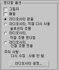 렌더링 매개변수 롤아웃에 있는 추가적인 직접 조명 렌더링 옵션은 직접 조명이 대응하는 메쉬에 저장되지 않게 합니다. 이것은 라디오시티, 직접 조명 렌더링 옵션에 대응하며 이럴 경우 정점 색상 할당은 라디오시티 메쉬로부터 간접조명을 받지만 렌더러는 직접 조명을 개별적으로 받습니다. 혹은 라디오시티, 간접 조명만 옵션에 대응할 경우는 정점 색상 할당은 정점에 직접 조명을 전혀 적용하지 않습니다.