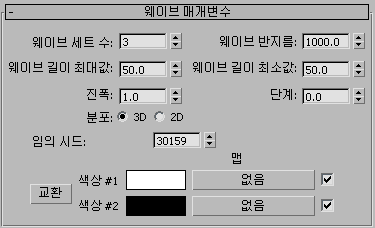 패턴에서 사용되는 웨이브 세트의 수를 지정합니다. 웨이브 세트는 오브젝트(2D 웨이브 분포의 경우 원형) 내의 가공의 구 표면을 따라 무작위로 계산된 지점에서 발생하는 방사상으로 대칭되는 웨이브의 그룹입니다. 잔잔한 물의 경우 이를 낮은 숫자로 설정하십시오. 물결이 거친 물의 경우 높은 숫자를 사용하십시오. 범위는 1에서 50 사이입니다. 기본값은 10입니다.